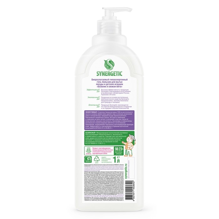 Биоразлагаемый гель-бальзам для мытья посуды и детских игрушек SYNERGETIC "Базилик и свежая мята" - это экологичное, безопасное и эффективное средство для мытья всех видов посуды, в том числе детской, кухонного инвентаря и детских игрушек от любых видов загрязнений.
