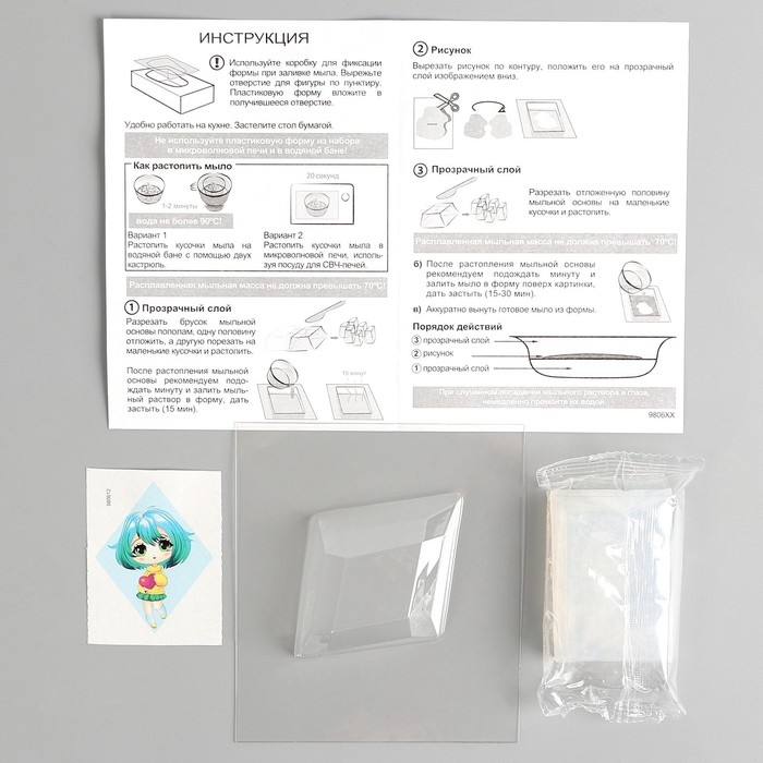 В набор входит: мыльная основа, формочка для отливки мыла, картинка, инструкция.