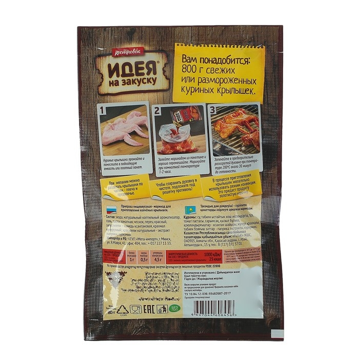 Маринад Костровок идеален для домашнего приготовления горячей закуски из куриных крыльев. Одного пакета маринада достаточно для приготовления 800 г крыльев. На обратной стороне упаковки указан рецепт приготовления.