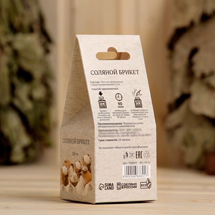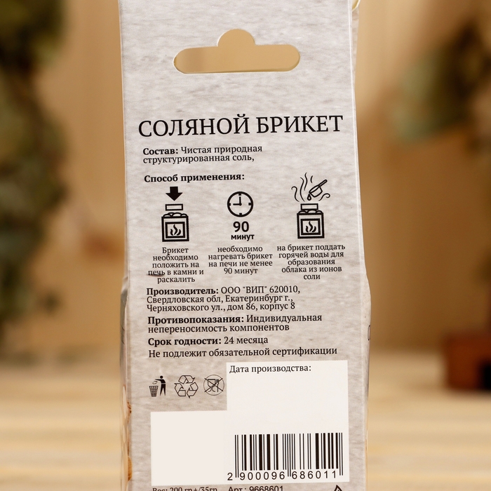 Применение: нагревайте брикет на печи не менее 90 минут, затем поддайте на него горячей воды. Соль наполнит воздух бани ионами, тем самым поможет снять усталость, улучшить кровообращение и общее самочувствие.