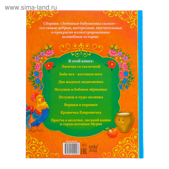 «Бабушкины сказки» — сборник любимых русских народных сказок. Известные персонажи, яркие иллюстрации помогут занять ребёнка, развить фантазию и привить любовь к чтению. Книга оформлена в твёрдом переплете, что позволит радовать вашего малыша долгое время!