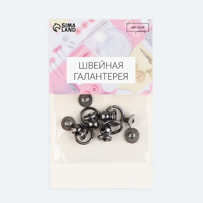 В наборе 4 штуки цвета чёрный никель. Диаметр шляпки 6 мм; диаметр основания 8 мм; высота 9 мм.