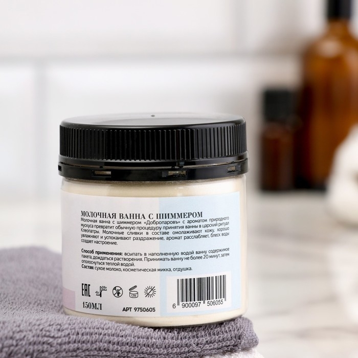 Молочная ванна с шиммером "Добропаровъ" с ароматов природного мускуса превратит обычную процедуру принятия ванны в царский ритуал Клеопатры. Молочные сливки в составе омолаживают кожу, хорошо увлажняют и успокаивают раздражение, аромат расслабляет, блеск воды создает настроение.