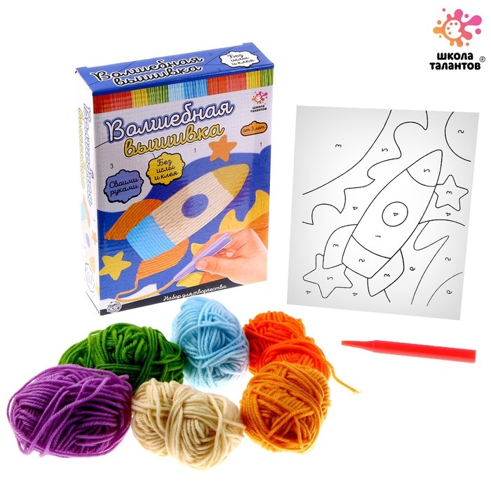 Такая поделка вышивается без иголки и клея. Выберите нужный цвет нити, проденьте её в колпачок и начинайте заполнять рисунок. Благодаря специальной основе нитки будут легко закрепляться и шаг за шагом превращаться в красивую картину!