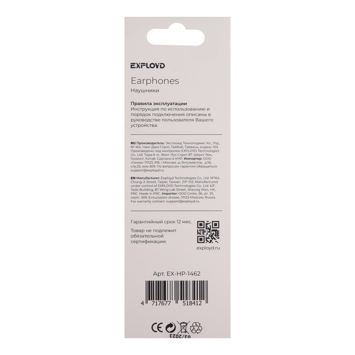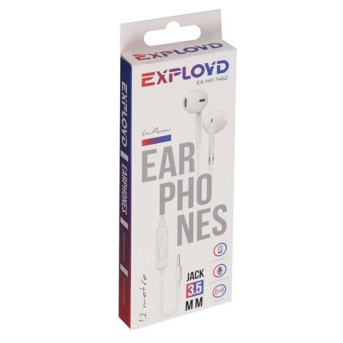 Наушники Exployd EX-HP-1462, вкладыши, микрофон, проводные, 108 дБ, 3.5 мм,1.2 м, белые