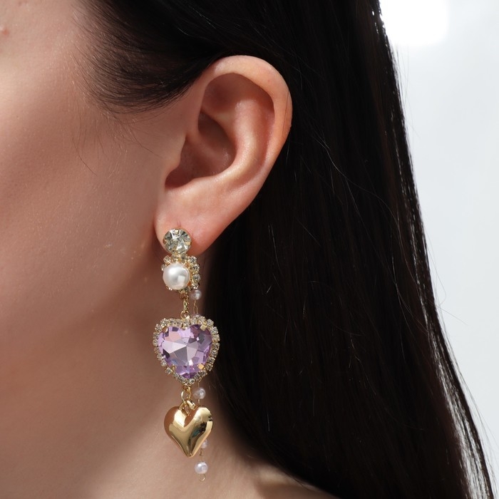 Серьги висячие со стразами «Сердце», цветные в золоте
