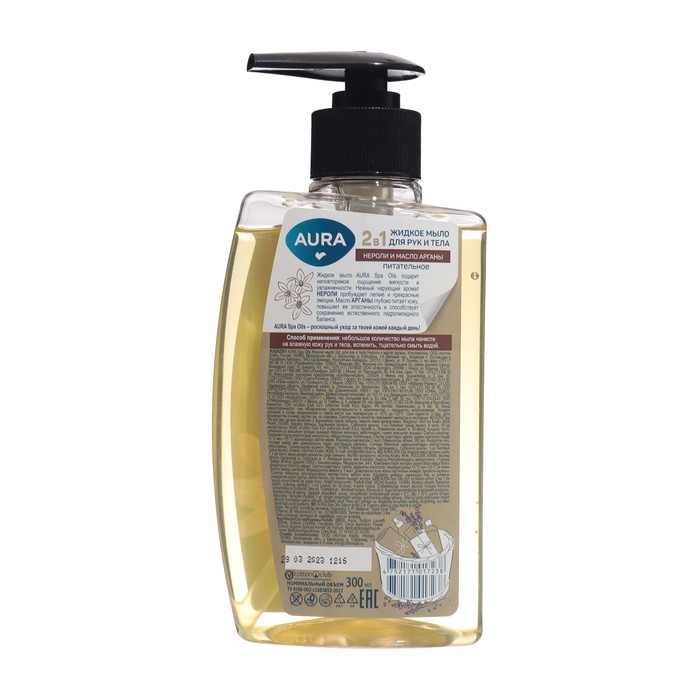 Мыло жидкое для рук и тела 2в1 AURA Spa Oils с нероли и маслом арганы, объемом 300 мл, - это роскошное средство для ухода, которое обеспечивает нежное очищение и увлажнение как для вашей кожи, так и для рук.