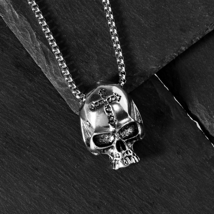 Кулон «Череп» с крестом, цвет чернёное серебро, L=70 см