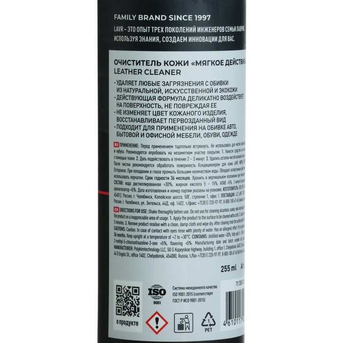 Очиститель кожи LAVR – профессиональное средство для быстрого и эффективного удаления загрязнений с натуральной и искусственной кожи в салоне автомобиля.