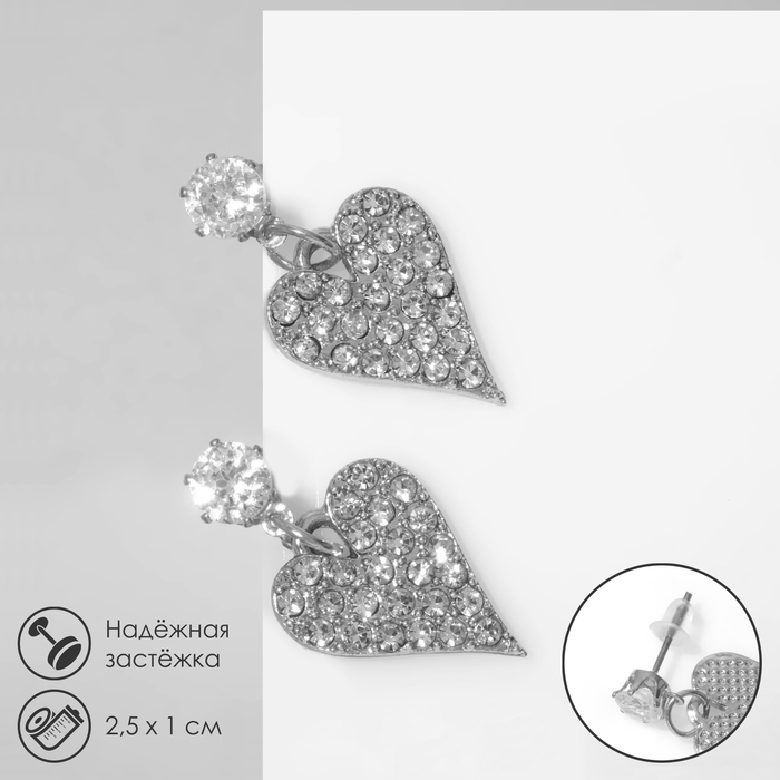 Серьги со стразами «Сердце» изящное, цвет белый в серебре