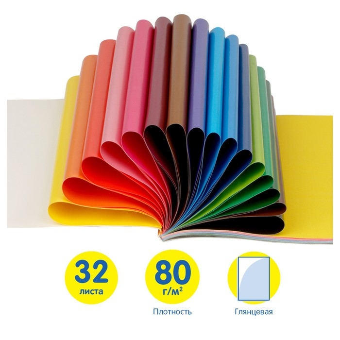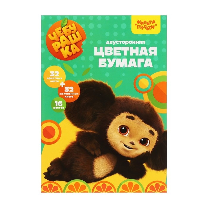 Цветная бумага двусторонняя А4, 16 цветов, 64 листа (32 листа мелованная + 32 листа офсетная), Мульти-Пульти "Чебурашка", на склейке