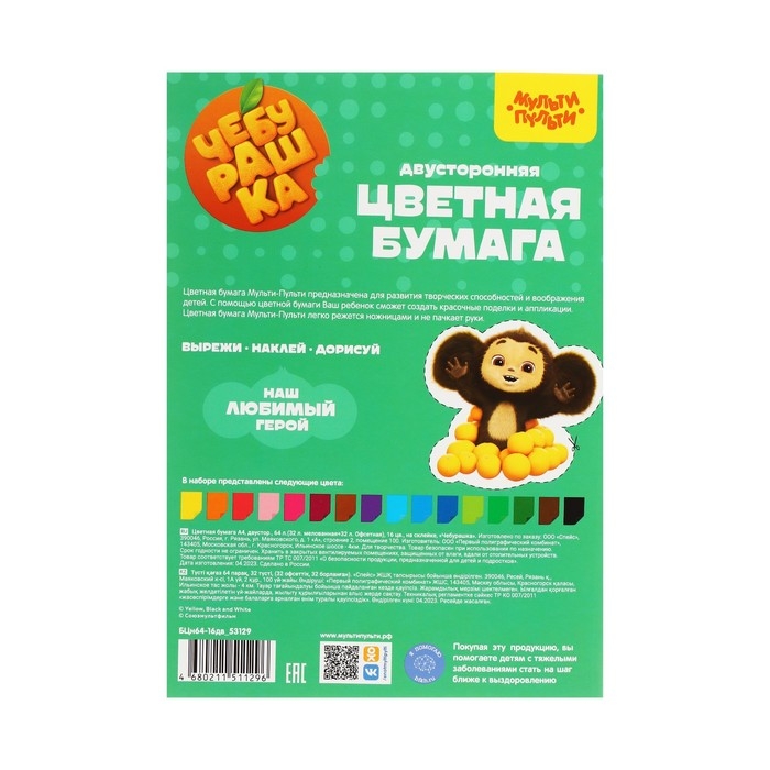 Набор цветной офсетной и мелованной двусторонней бумаги "Мульти-Пульти" серии "Чебурашка" идеально подойдет для творчества. На оборотной стороне обложки расположен персонаж, которого можно вырезать и сделать с ним аппликацию. Бумага имеет размер 200 х 280 мм. В блоке представлены 2 вида бумаги одновременно: Офсетная матовая плотная бумага и мелованная глянцевая плотная бумага. Плотность офсетной и мелованной бумаги – 80 г/м2. Разные виды бумаги в наборе позволяют сделать совершенно удивительные творческие поделки как с применением матовой, так и с применением глянцевой бумаг. В наборе представлено 64 листа 16 цветов (по 32 листа 16 цветов на каждый вид бумаги), скрепленных клеевым скреплением. Бумага окрашена с двух сторон, обложка выполнена из качественного картона. Товар сертифицирован для детей от 3 лет.