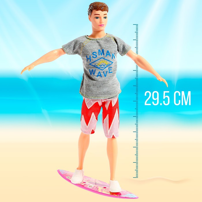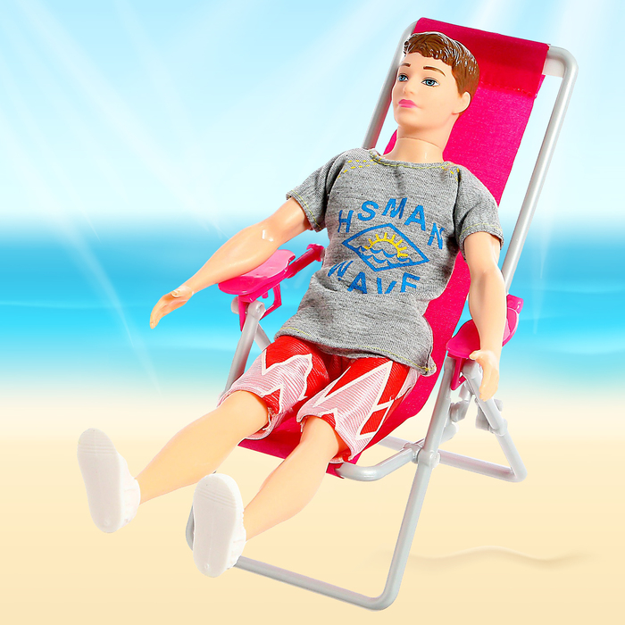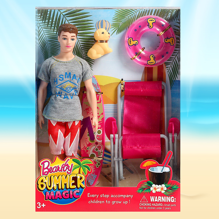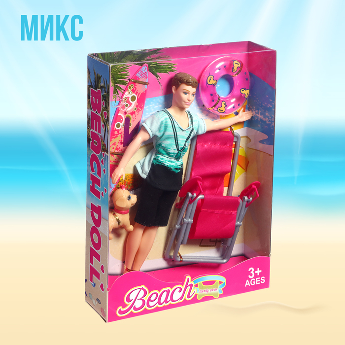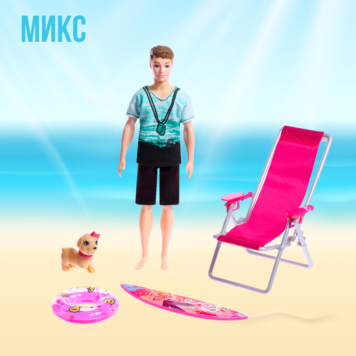 Этот набор станет желанным подарком для веселой игры любой девочки. Кукла-кен ждёт ребёнка, чтобы отправиться на пляж. У него есть друг — милый щенок. Ребёнок придумает ему имя. В комплект входят: надувной круг для плавания куклы, доска для сёрфинга, шезлонг.