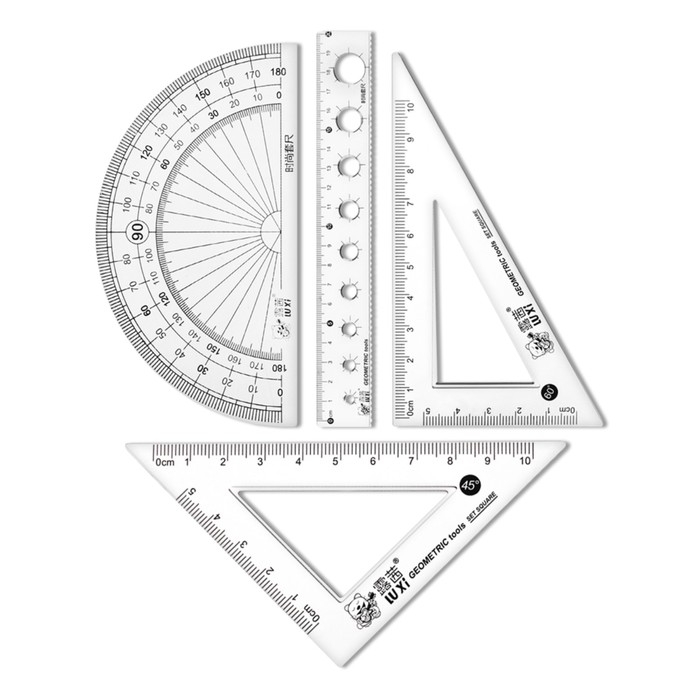 В комплекте: линейка 20 см, 2 угольника, транспортир в пенале.