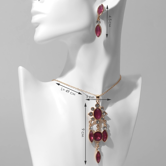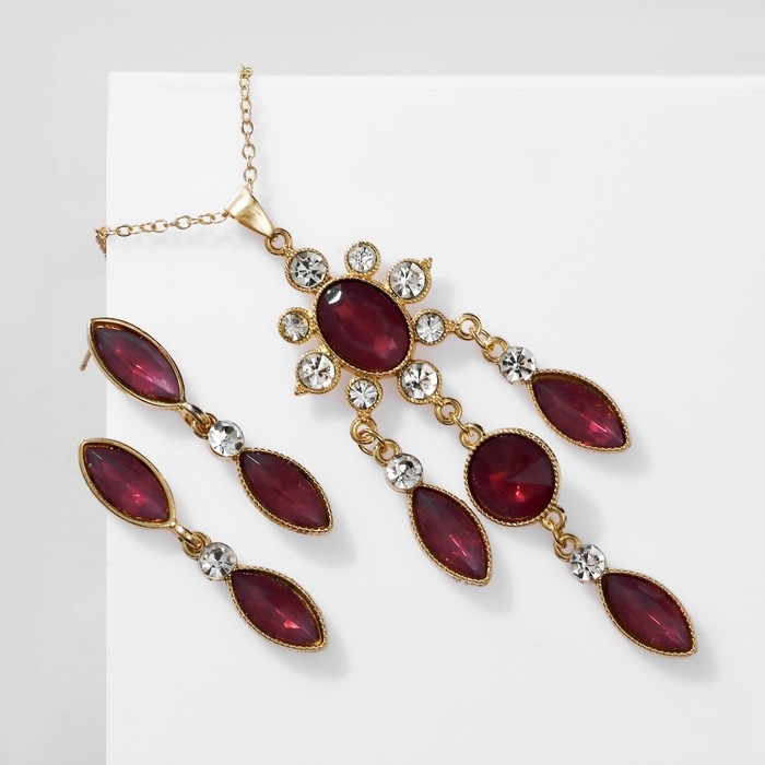 Гарнитур 3 предмета: серьги, кулон, кольцо безразмерное «Эдель» ромб, цвет бордовый в золоте, 45 см