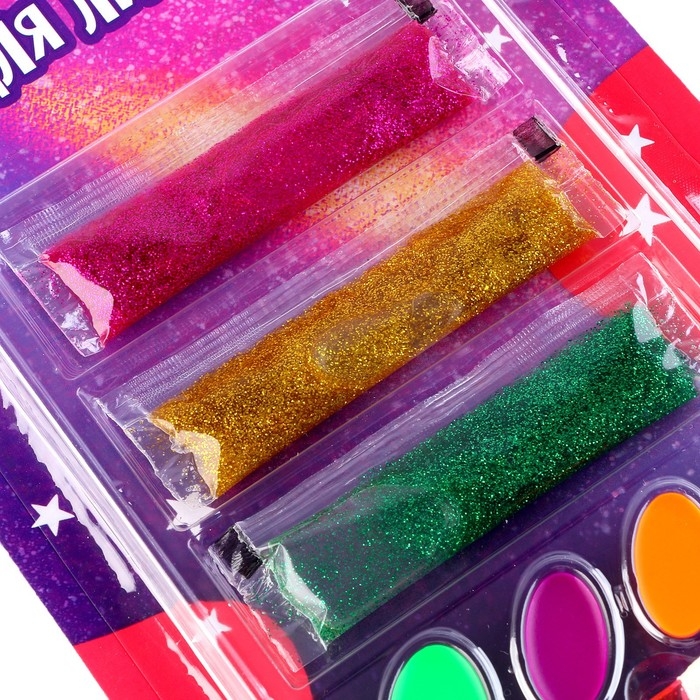 В наборе: 4 ярких оттенка грима, аппликатор, 3 геля с блёстками.