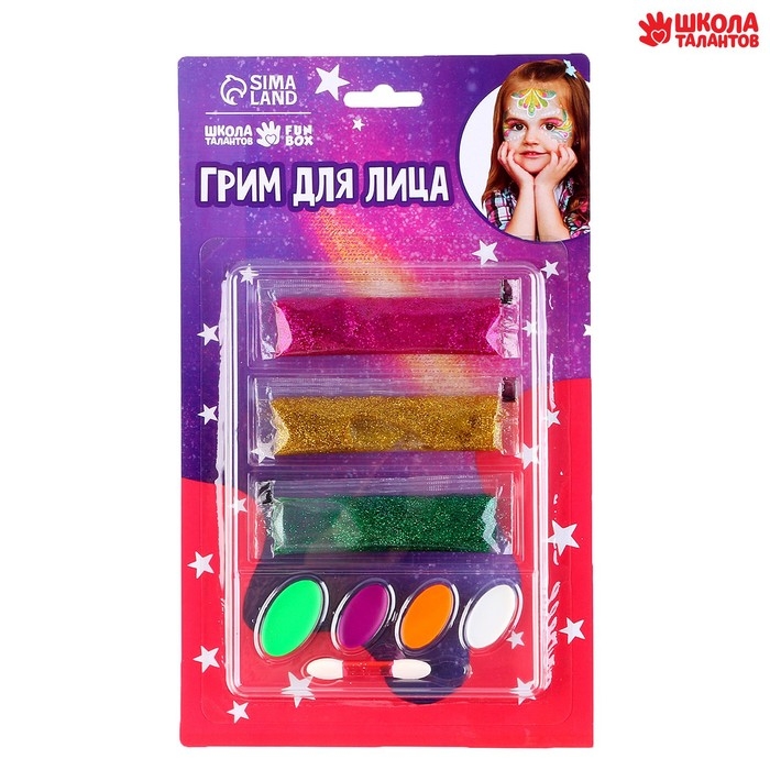 Грим для лица и тела, 4 цвета + 3 геля с блестками + аппликатор