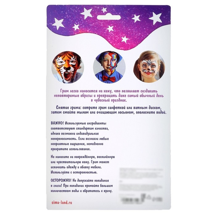 Перед использованием проверьте наличие аллергической реакции или непереносимости компонентов. Для этого нанесите на небольшой участок кожи аквагрим и оставьте на 20 минут. При появлении сыпи, зуда или воспаления немедленно смойте и обратитесь к врачу.