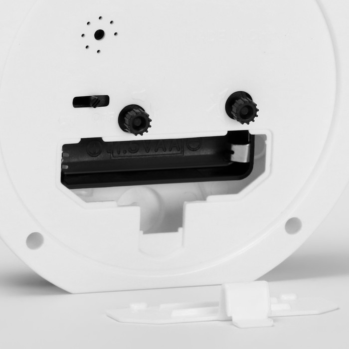- Будильник оснащён кварцевым механизмом с дискретным ходом стрелок.