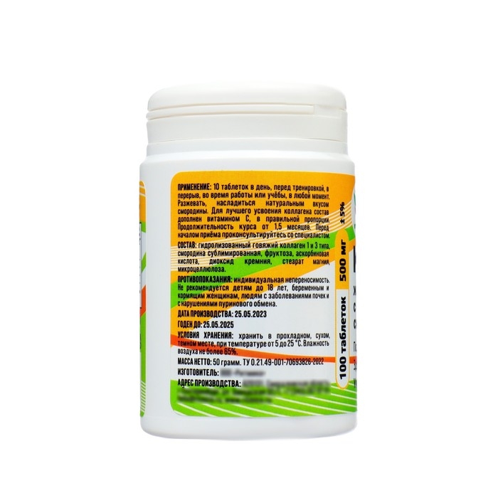 Состав: гидролизованный говяжий коллаген 1 и 3 типа, смородина сублимированная, аскорбиновая кислота, диоксид кремния, стеарат магния, микроцеллюлоза.