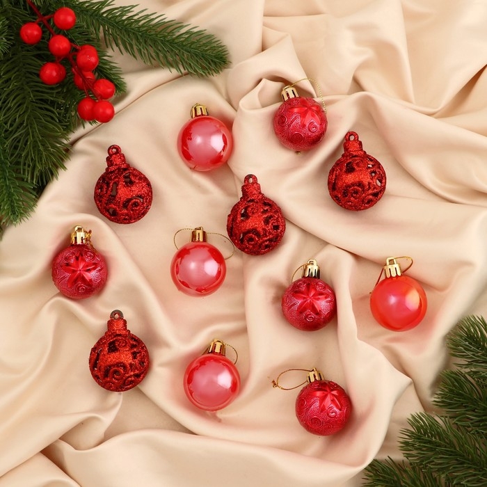 Набор шаров пластик d-4 см, 12 шт "Мелодия" орнамент, красный