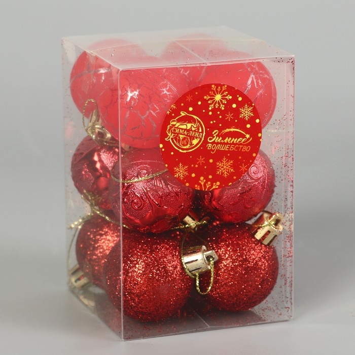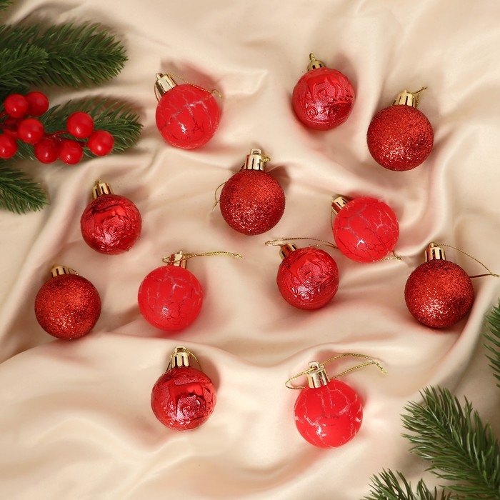 Набор шаров пластик d-4 см, 12 шт "Мелодия" узор треск, красный