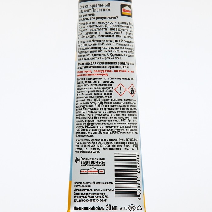 Момент Пластик - специальный контактный клей для надежного соединения изделий из пластиков. Совместим с большинством пластиковых материалов. Прозрачный. Водостойкий. Склеивает в различных комбинациях мягкий и жесткий поливинилхлорид, полистирол, оргстекло и другие виды пластика. Не пригоден для склеивания стиропора, полиэтилена, полипропилена, пластифицированного ПВХ.