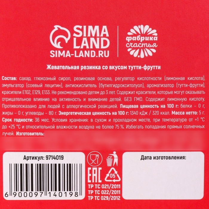 Состав: сахар, глюкозный сироп, резиновая основа, регулятор кислотности (лимонная кислота), эмульгатор (соевый лецитин), антиокислитель (бутигидрокситодуол), ароматизатор (тутти-фрутти), красители Е102, Е129, Е133.