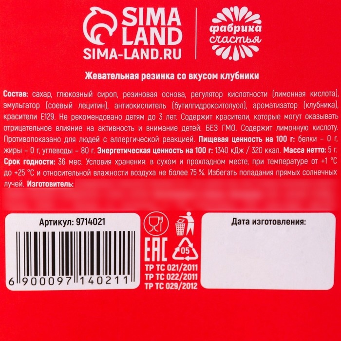 Состав: сахар, глюкозный сироп, резиновая основа, регулятор кислотности (лимонная кислота), эмульгатор (соевый лецитин), антиокислитель (бутигидрокситодуол), ароматизатор (клубника), красители Е129.