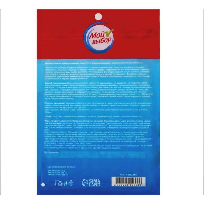 Способ применения: Брать капсулу сухими руками! Не прокалывать, не разрывать, не надрезать! 100% водорастворимая пленка. Капсула помещается непосредственно барабан стиральной машины перед загрузкой белья: 1 капсула используется 4-5 кг сухого белья, для более 5 кг или при сильном загрязнении использовать 2 капсулы. Соблюдать рекомендации для стирки, указанные на бирке одежды (изделия из ткани). Не применять режим замачивания и предварительную стирку. Не рекомендуется использовать для режимов автоматической стирки длительностью менее 40 минут.