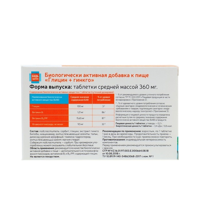 Глицин + гинкго "Будь Здоров!" поддержка мозга, 50 таблеток
