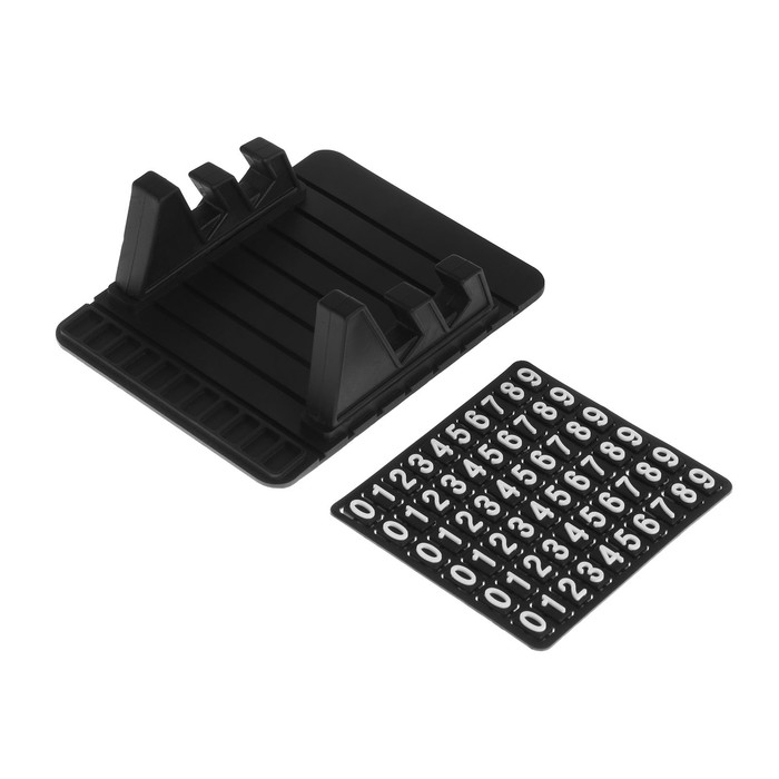Коврик противоскользящий с двойной подставкой под телефон и номером телефона — простой аксессуар, уже давно завоевавший популярность среди владельцев авто за функциональность и универсальность. Можно размещать его, где душе угодно, но чаще всего такой ценный аксессуар располагают на торпеде, чтобы держать на нем телефон или иной автогаджет. Автовизитка с номером телефона имеет не подвижную конструкцию. Набор имеет трафарет с цифрами от 0 до 9, что позволяет быстрого и легкого составить номера телефона. Парковочная табличка залог спокойствия водителя.