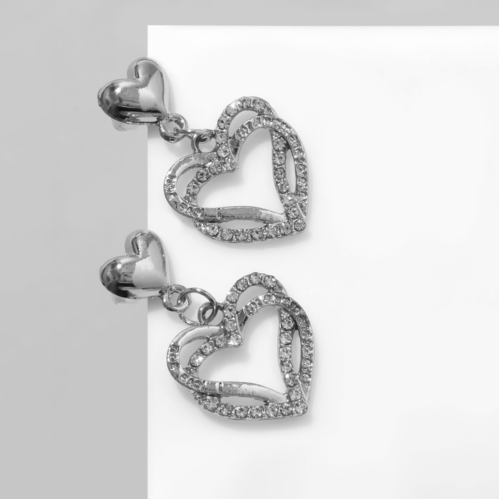 Серьги со стразами «Сердца» связанные, цвет белый в серебре