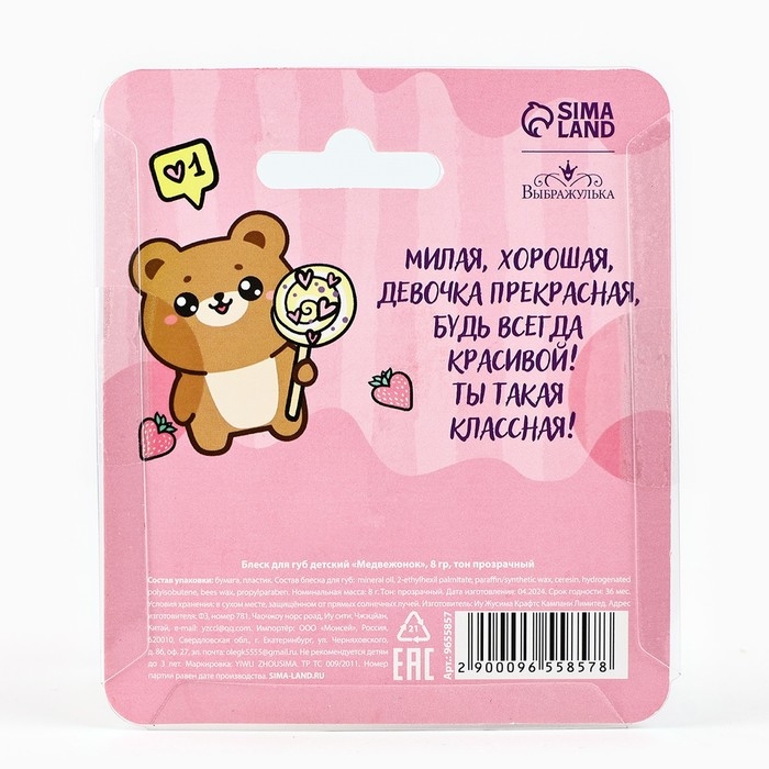 Блеск для губ детский в яркой баночке в виде медвежонка придает губам легкий деликатный блеск без ощущения липкости, делает губы гладкими и красивыми. Он комфортно ощущается на коже, абсолютно безопасен для ребенка и подходит для частого использования.