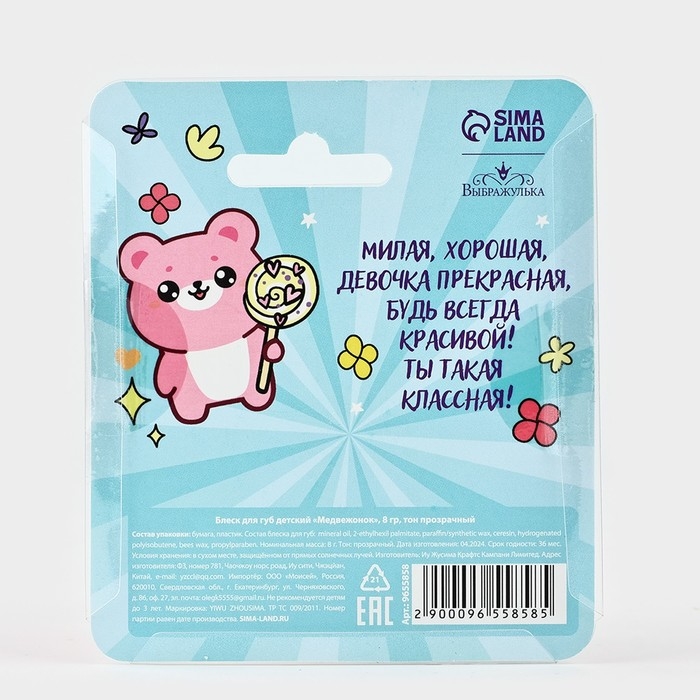 Блеск для губ детский в яркой баночке в виде медвежонка придает губам легкий деликатный блеск без ощущения липкости, делает губы гладкими и красивыми. Он комфортно ощущается на коже, абсолютно безопасен для ребенка и подходит для частого использования.