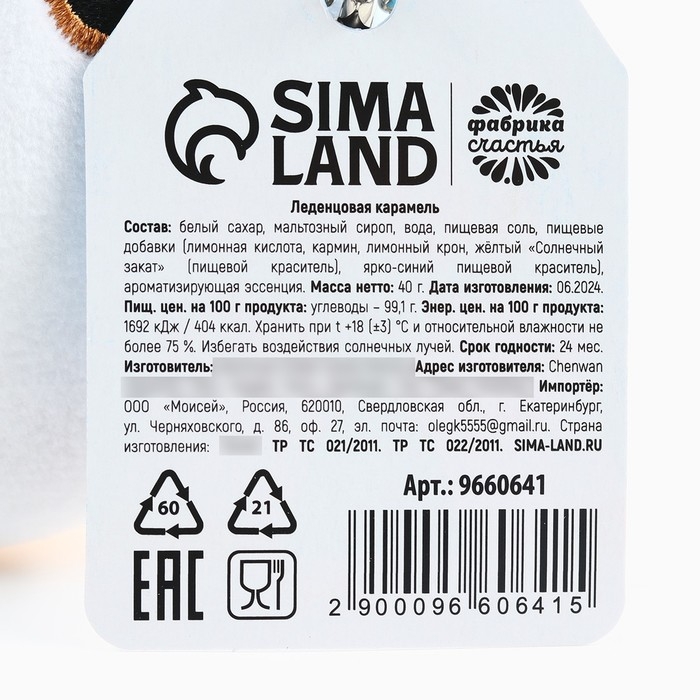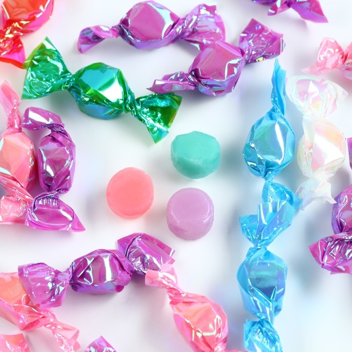 Состав: Белый гранулированный сахар, мальтозный сироп, пищевые добавки (лимонная кислота, красный очаровательный АС (пищевой краситель), лимонно - жёлтый (пищевой краситель), бриллиантовый синий (пищевой краситель), эритрозин), ароматизирующая пищевая эссенция.