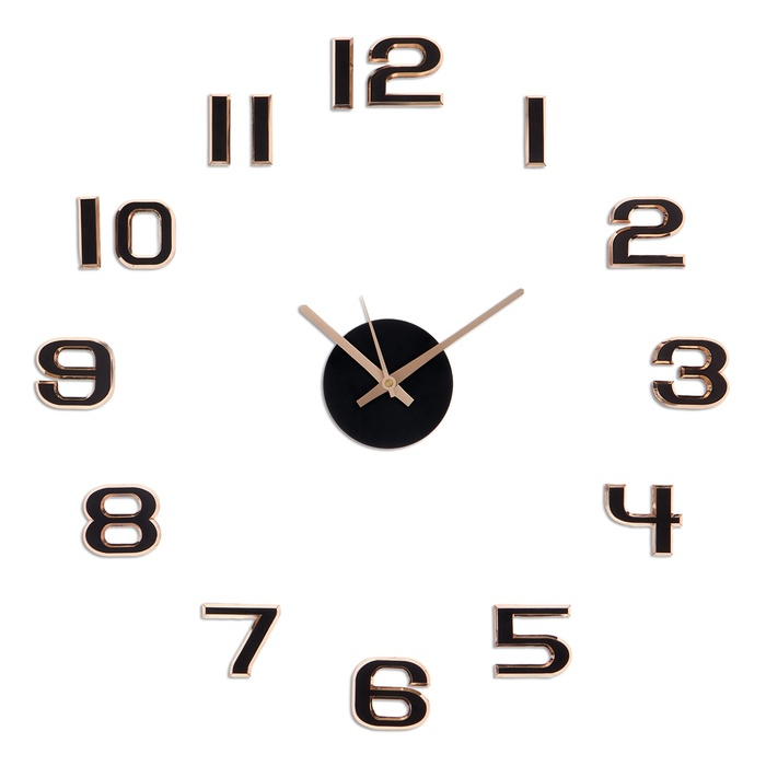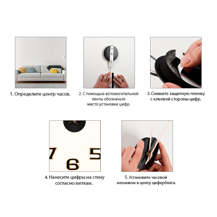 Создавайте часы в собственном стиле, проявляйте изобретательность и креативность. Не обязательно располагать числа по кругу — придайте аксессуару необычную форму, поменяйте диаметр циферблата, используйте не все элементы. Комплектующие легко клеятся на стену и без труда снимаются.