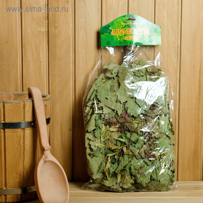 Веник для бани дубовый "Ароматы леса" с травами, в индивидуальной упаковке