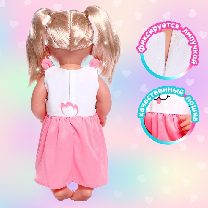 - Платье фиксируется липучкой сзади, поэтому выглядит аккуратно и хорошо сидит на пупсике. А ещё с такой застёжкой малышка сможет быстро переодеть куклу.