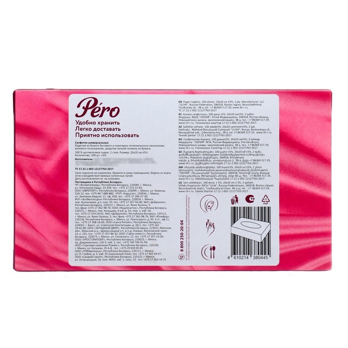 Салфетки в коробочке Pero обеспечивают максимальный комфорт и нежность при каждом использовании. Отличный выбор для использования дома, в офисе, в автомобиле или в путешествиях. Салфетки легко достаются из коробки одна за другой в формате нон-стоп