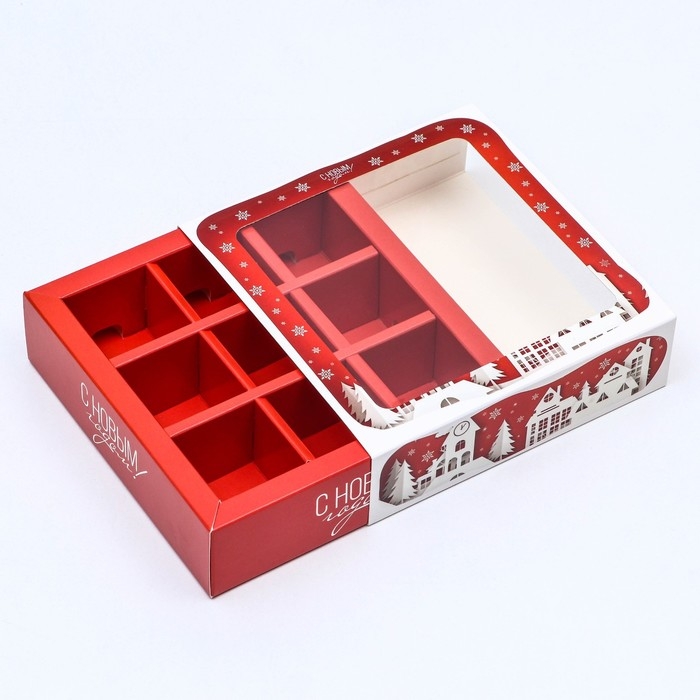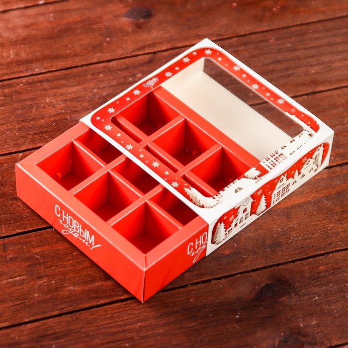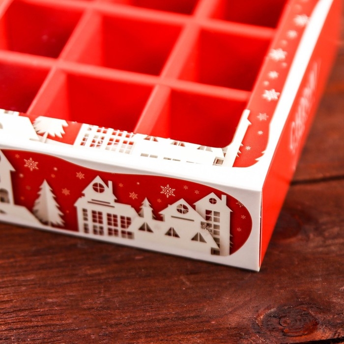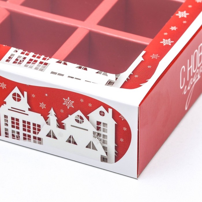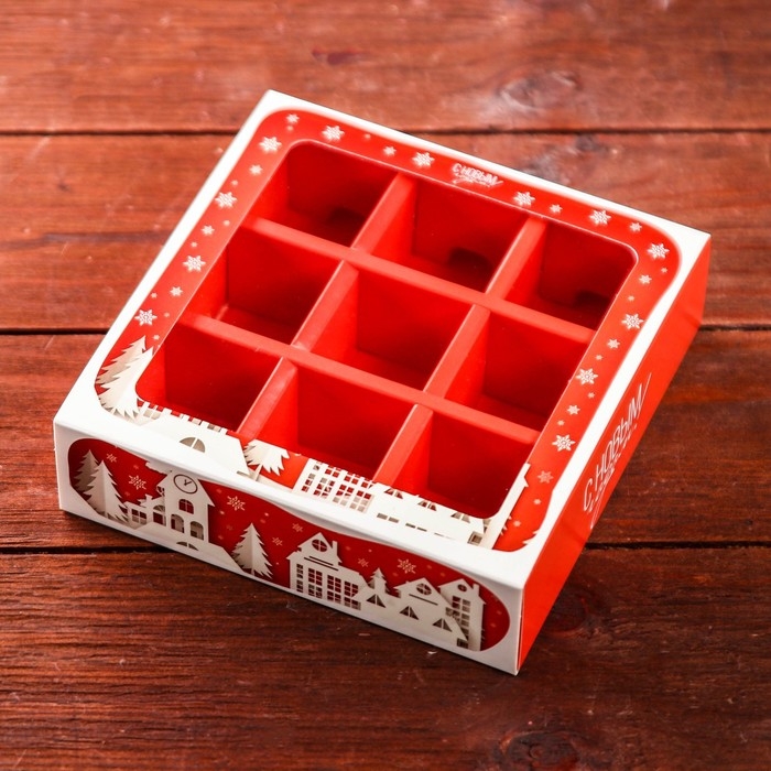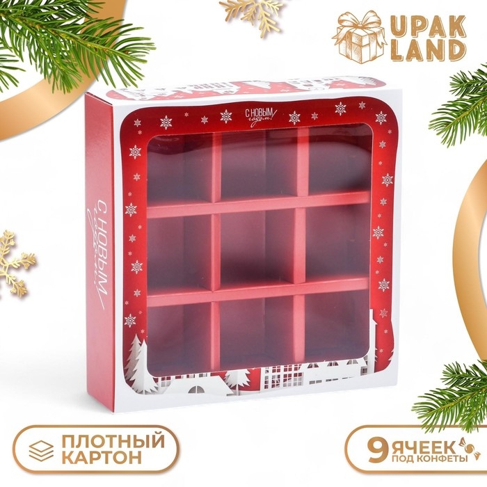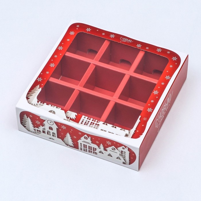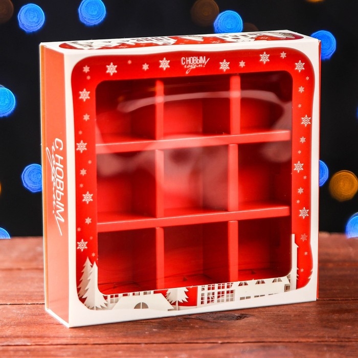 Новый год. Коробка для 9 конфет с обечайкой "Дом Деда Мороза" подарочная новогодняя упаковка, 13,7 х 13,7 х 3,5 см.
