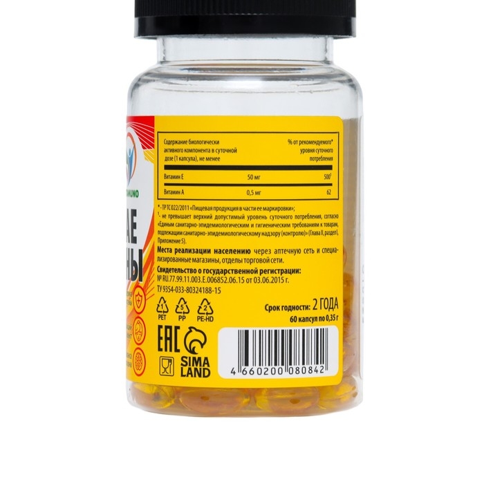 Состав: Масло подсолнечное, желатин пищевой, глицерин, витамин E (альфа-токоферол), витамин А (ретинола-пальмитат), бензоат натрия (консервант).