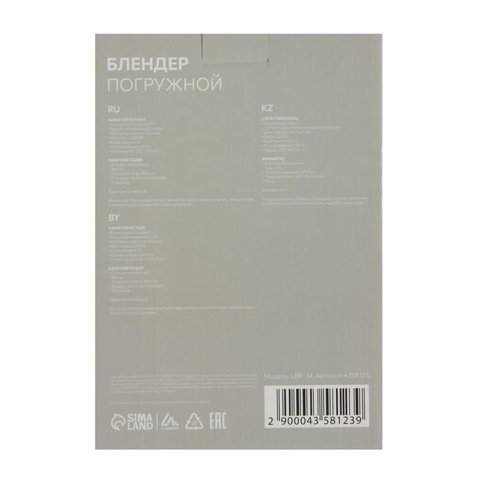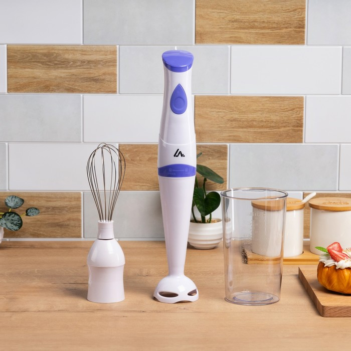 Блендер Luazon LBR-24, погружной, 250 Вт, 0.6 л, 1 скорость, бело-фиолетовый