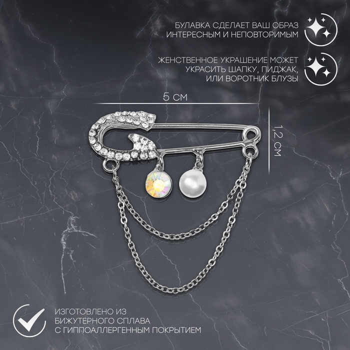 Данная булавка – настоящая находка для модниц, предпочитающих нетривиальные аксессуары. Брошь-булавка станет не только оригинальным дополнением вашего наряда, но и позволит без труда приколоть при необходимости палантин или шейный платок. Используйте её в качестве украшения шляпки, рубашки или галстука. Булавка «Классик», 5 см, цвет радужно-белый в серебре внесёт особую нотку изящности в ваш образ.