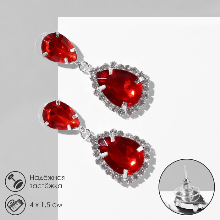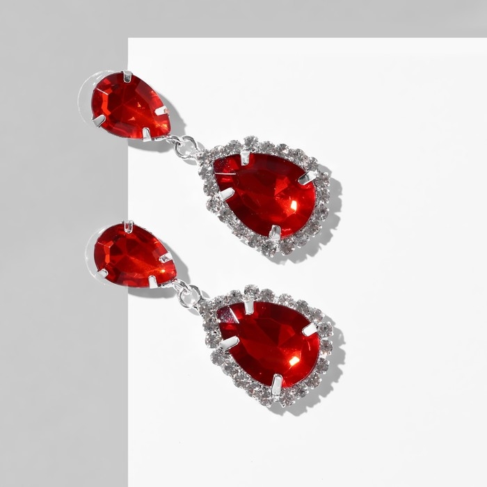 Серьги со стразами «Капля» элегия, цвет красно-белый в серебре