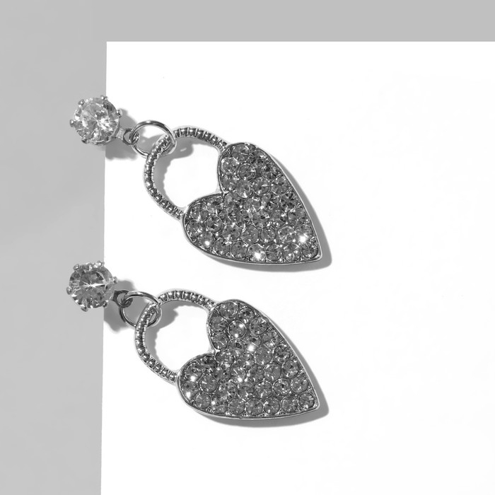Серьги со стразами «Сердца» замки, цвет белый в серебре