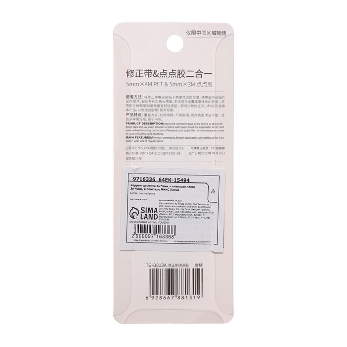 Корректор-лента 4м х 5мм + клеющая лента 3м х 5мм, в блистере "Лапка" МИКС