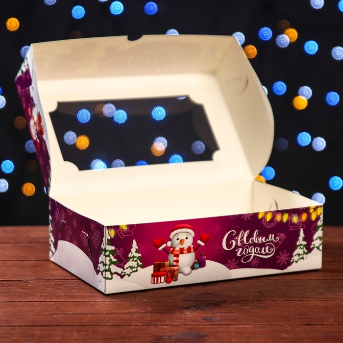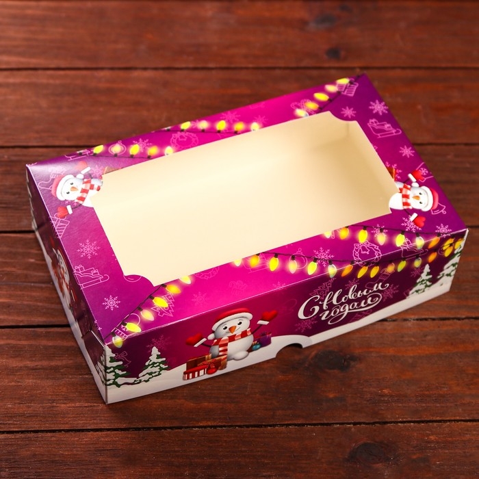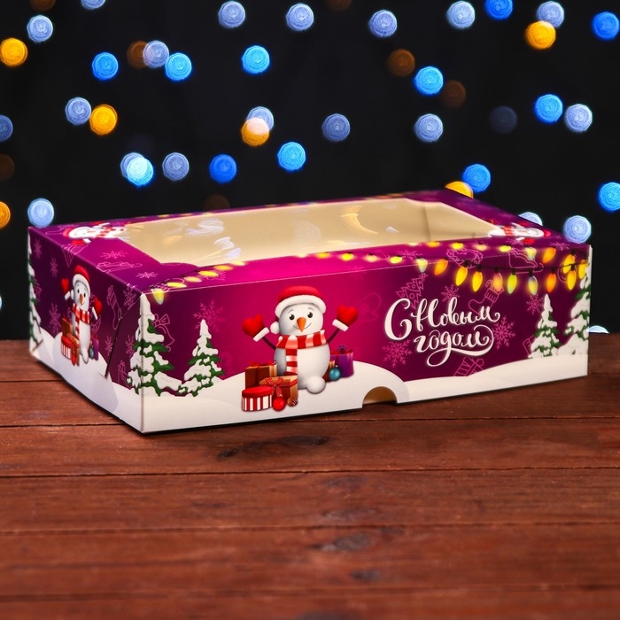 Новый год. Коробка складная, подарочная новогодняя с окном под зефир "Снеговик с подарками", 25 х 15 х 7 см.