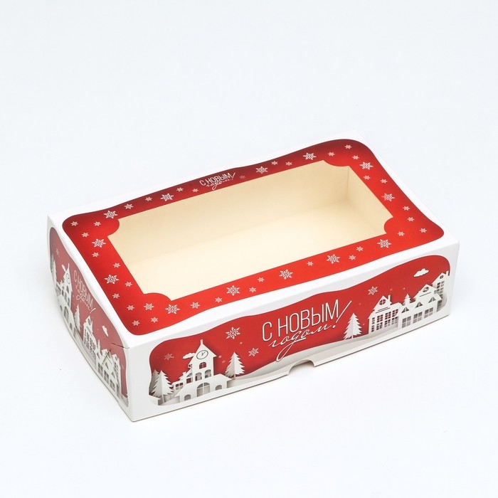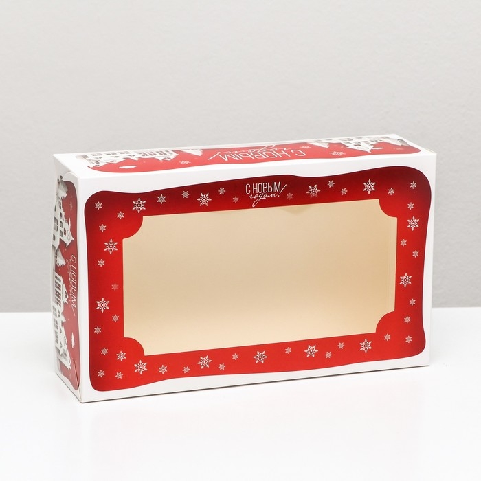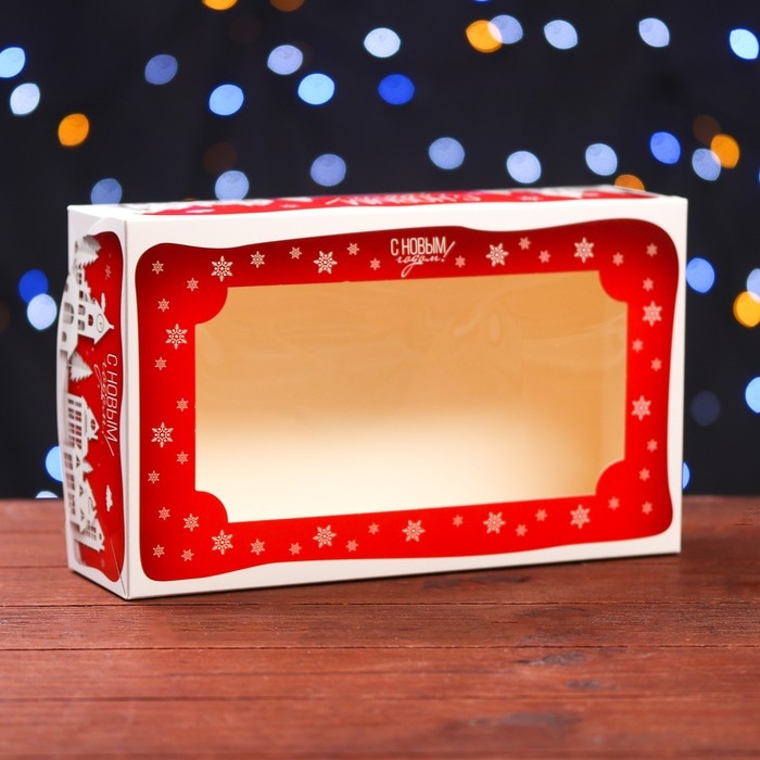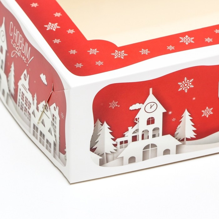 Новый год. Коробка складная, подарочная новогодняя с окном под зефир "Дом Деда Мороза", 25 х 15 х 7 см.