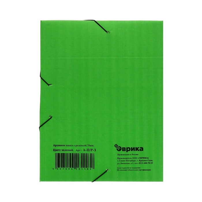 Папка архивная на резинках формата А4 идеально подойдёт для хранения документов. Товар изготовлен из микрогофрокартона зеленого цвета. Папка обеспечивает максимальный доступ к документам при раскрытии. Прочная конструкция и стандартизованный размер позволяют хранить документы вертикально и горизонтально на стеллажах или в архивных коробах. На лицевой и боковых гранях имеются поля для маркировки. Размер папки: 235 х 75 х 325 мм, ширина корешка: 75 мм, вместимость 700 листов.